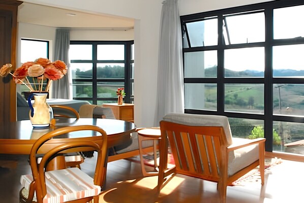 A vista do quarto é espetacular. O chalé faz parecer a nossa casa de tão aconchegante. O café da manha é servido em forma de picnic no quarto. Só consideraria ter mais variedade de opções para escolher no café. O restante eu achei perfeito